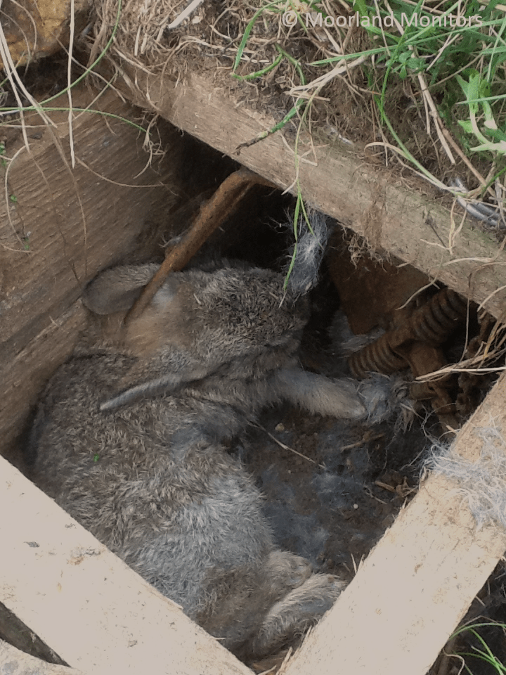 Spring traps are often found attached to logs over gullies or streams on the moor, or along the bottom of dry stone walls, where they may be hidden by a large stone or wooden box. Thousands are used on the grouse moors in this pattern. Others may be discovered on open moorland, where they have been implicated in raptor persecution.