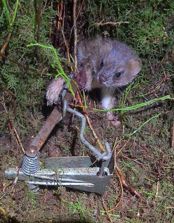 Spring traps are ostensibly set to catch and kill small mammals such as stoats and weasels. They are often baited with eggs or carrion, which entice animals into the brutal jaws of the trap. Spring traps cause long, slow deaths, snapping the bones of small mammals and birds, and detaining them until they die.
